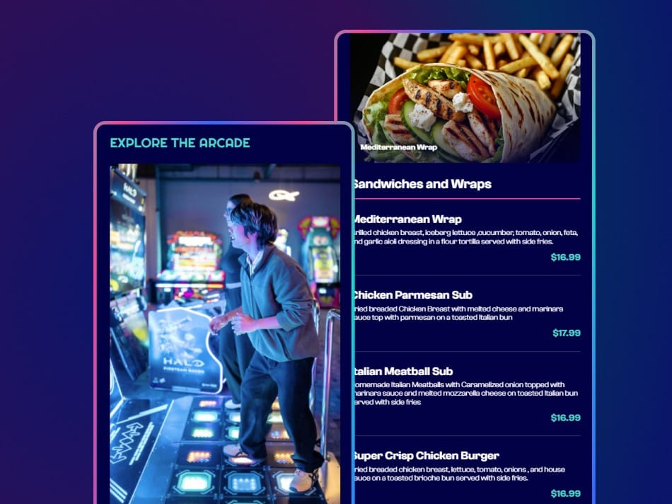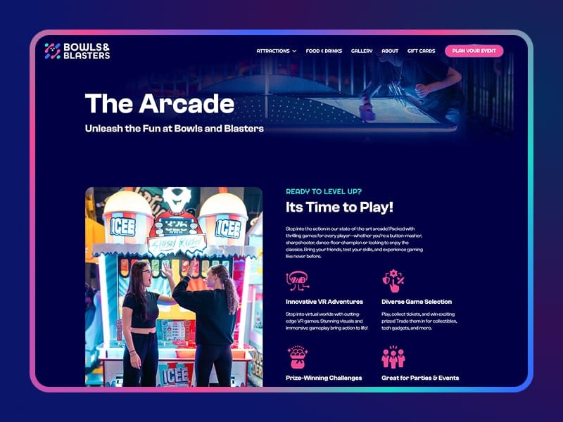 The finished site captures the playful energy of Bowls & Blasters and makes it easy for users to engage with. Visitors can explore the arcade and bowling options, browse the food menu, and plan their visit using a layout that works across all screen sizes. The design is fun but never chaotic, creating a digital space that supports the in-person experience with clarity and energy.