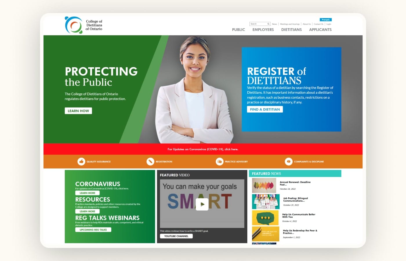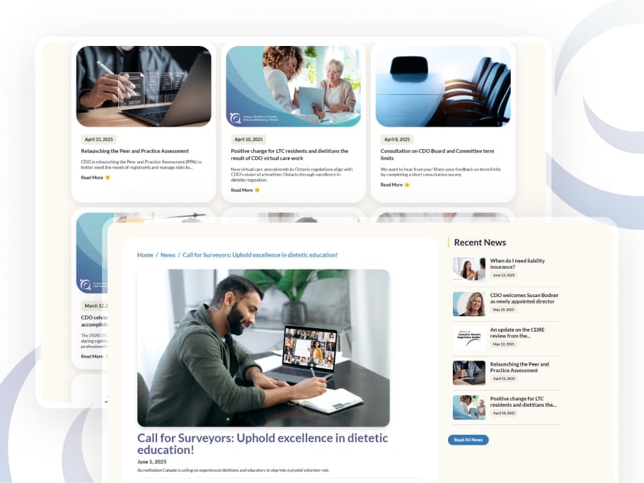 The College’s original website had a wealth of information but was difficult to navigate and visually outdated. For many users, including dietitians, students, and members of the public, the experience felt overwhelming. Content was dense and it was hard to find key tools or resources. The challenge was to create a site that better reflected the College’s evolving role in education and public protection, while making it easier for all users to access what they need.