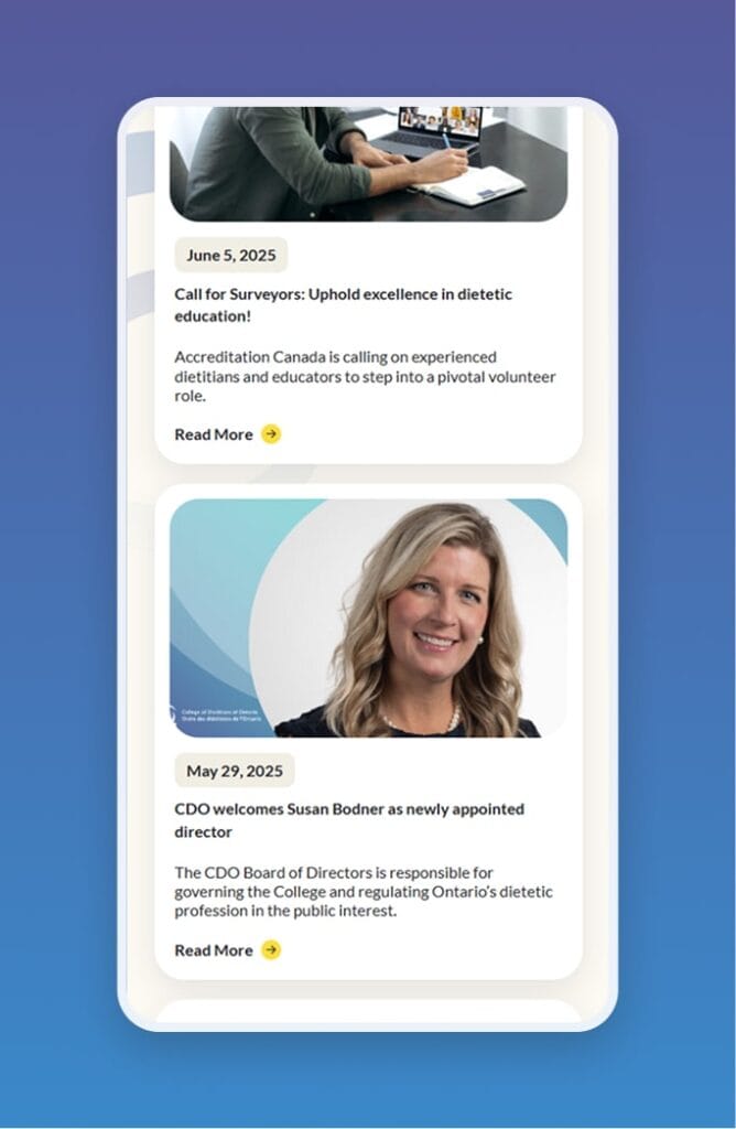 The redesigned website is now easier to use, easier to understand, and far more engaging. Users can find information faster, whether they are looking for registration details, professional resources, or public protections. Clear page structures and updated visuals create a better experience for dietitians and the public alike. The new design balances form and function, offering a platform that supports both transparency and education, which are core to the College’s mission.