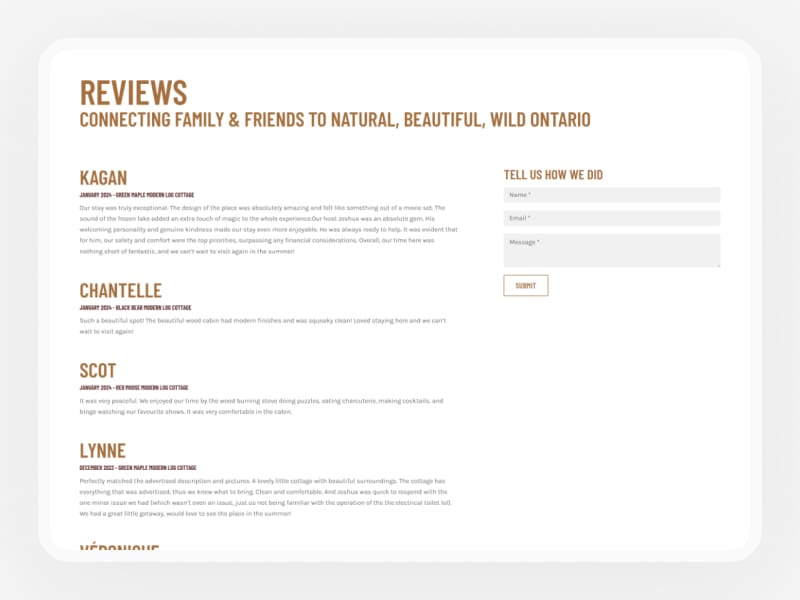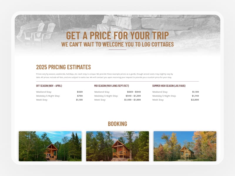 When it first started, Commanda Log Cottages had no website or formal brand identity. Potential guests had no clear way to explore the cottages, learn about amenities, or make reservations online. The challenge was to create a full digital presence from the ground up that captured the cozy, rustic, family-friendly charm of the cottages while providing an intuitive, seamless booking experience.