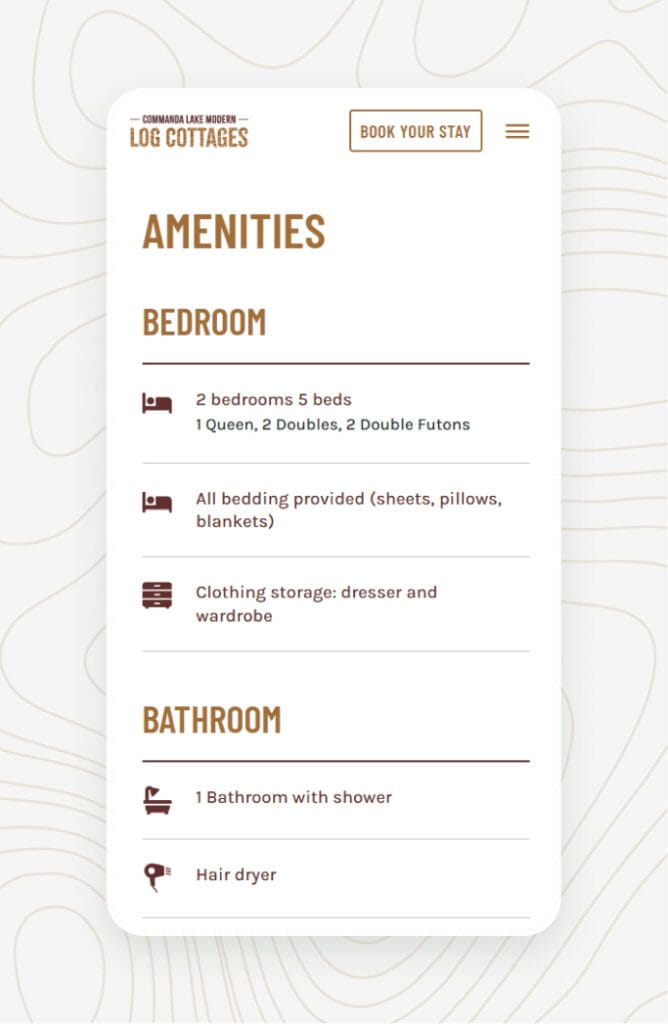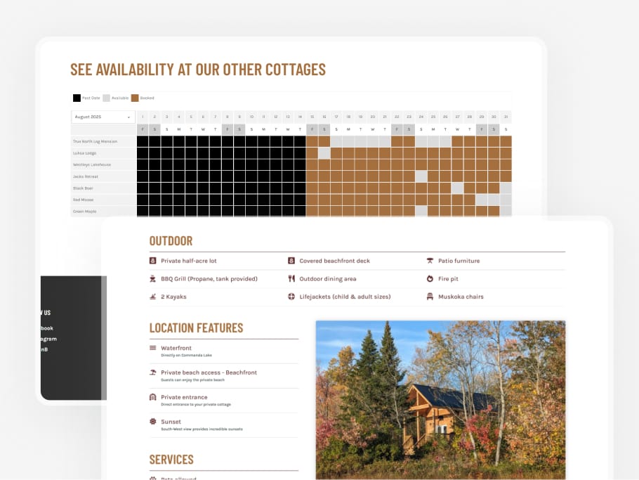 The Luksa Collective’s Commanda Lake Modern Log Cottages offer three private, fully equipped cottages on the shores of pristine Commanda Lake in Restoule, Ontario. Each cottage features 620 sq. ft. of space with a complete kitchen, barbecue, spacious roofed deck, and sleeping accommodations for up to seven guests. With 120 ft. of lakefront per property, private beaches, and seclusive boreal forest surroundings, the cottages provide a peaceful escape where families, friends, and couples can rest, play, and explore the surrounding lake and township activities. The team approached us to create a website that would reflect the cozy, rustic charm of the cottages while making reservations simple and seamless.