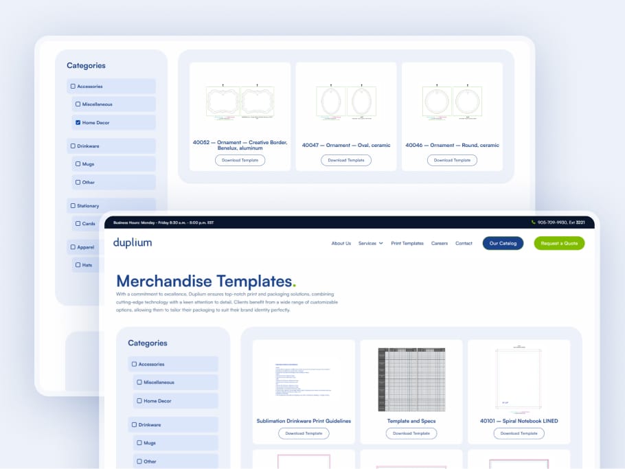 To support their custom workflow, we created a dedicated print template page that allows clients to browse and download templates based on specific product categories. A custom sorting system makes navigation intuitive and efficient. The careers section is also editable through the WordPress backend, allowing Duplium to easily manage job postings and keep hiring opportunities up to date.