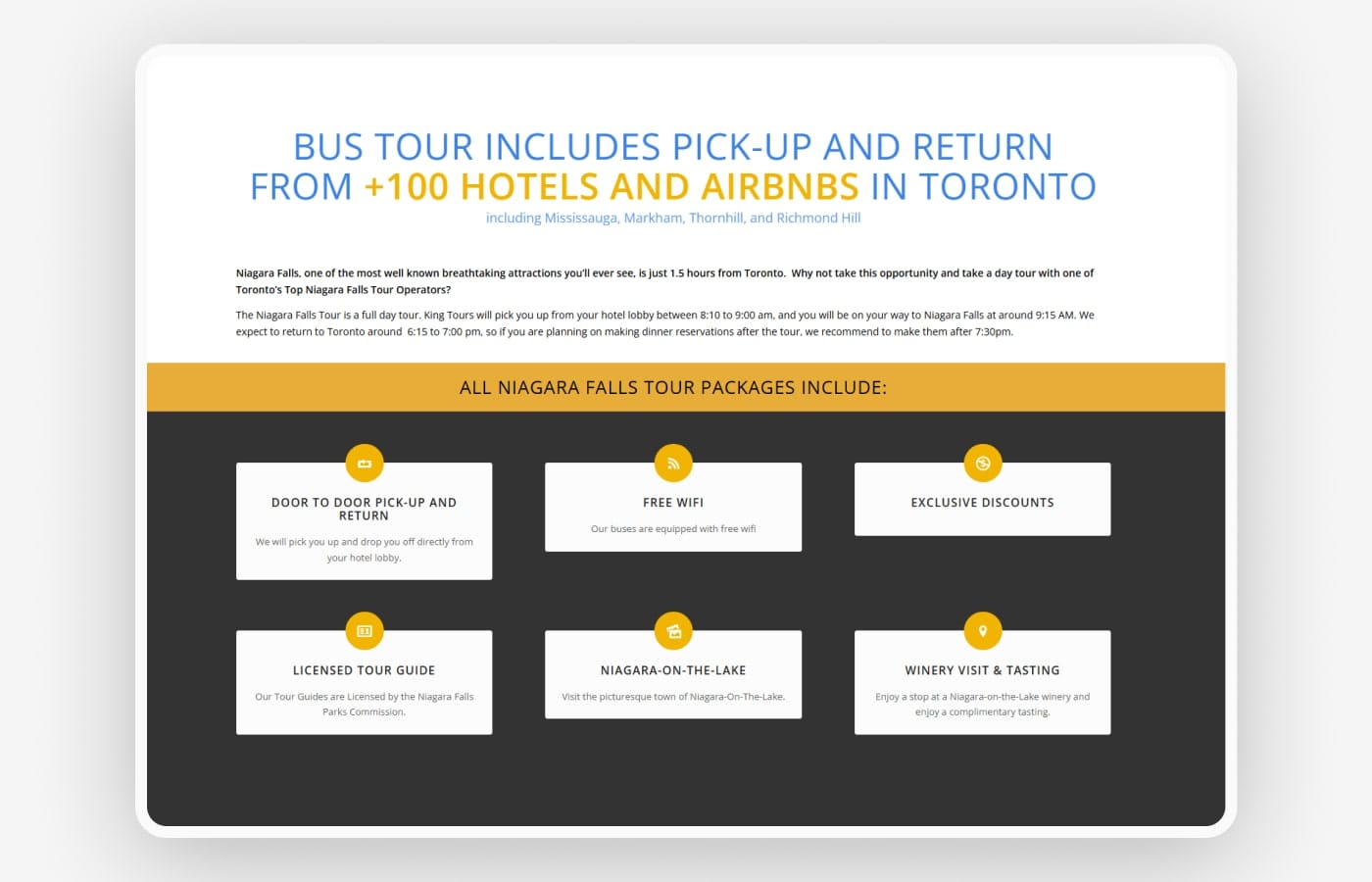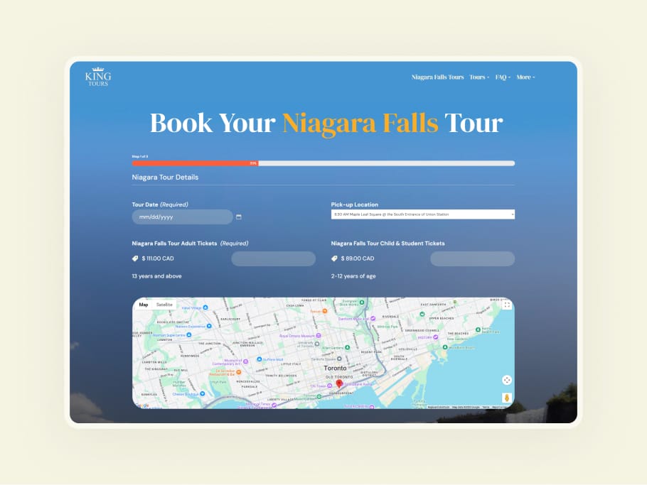 Despite being a trusted name in the travel space, King Tours’ old website felt outdated, flat, and confusing to navigate. Visitors struggled to find key information or book tours with confidence. The brand needed a site that reflected the ease and excitement of their Niagara Falls experience while streamlining everything from exploration to booking.