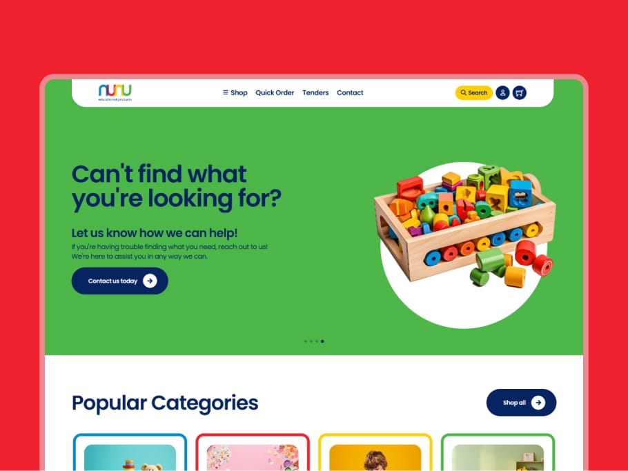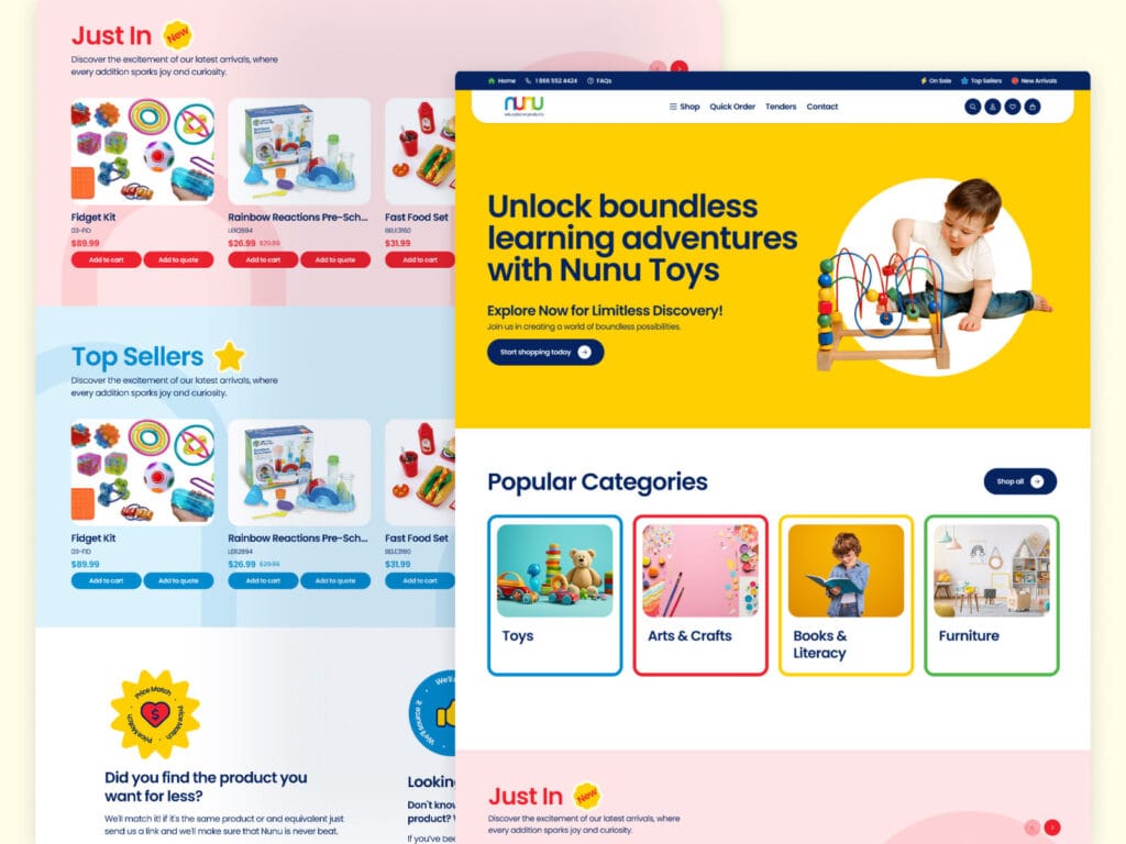 The redesign focused on creating a joyful, clean, and easy-to-navigate experience that reflected the Nunu Toys brand. We used a vibrant and energetic palette to bring warmth and personality to the interface without overwhelming the content. Rounded elements, playful icons, and soft spacing created a child-friendly atmosphere, while WooCommerce and Bricks Builder ensured a smooth and scalable backend for e-commerce. Navigation and filtering systems were restructured to help parents and educators browse with ease and confidence.