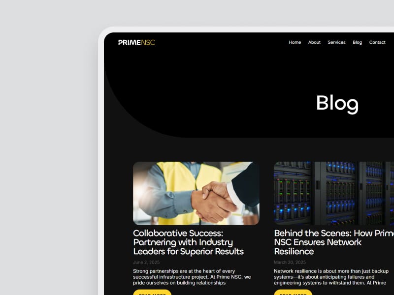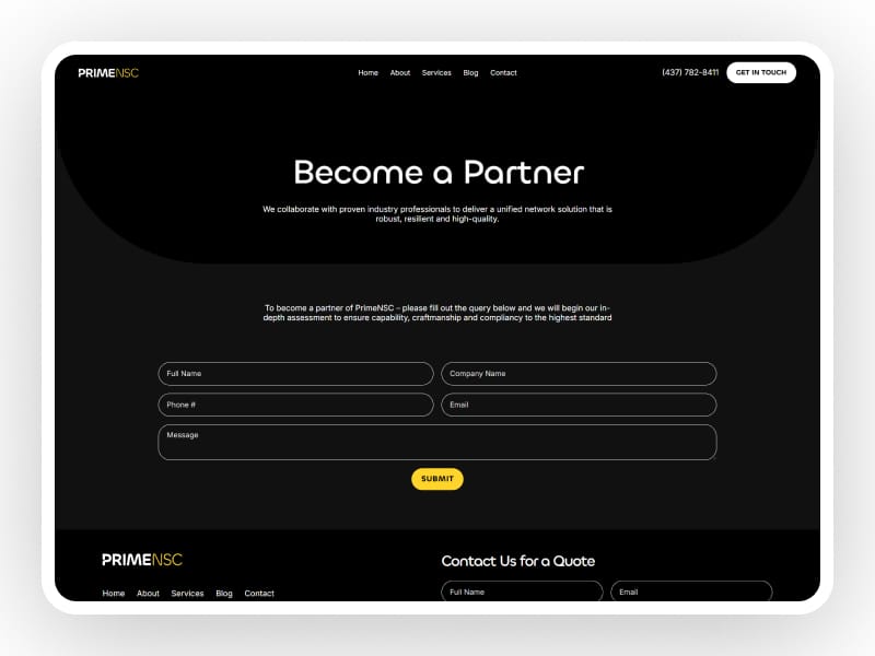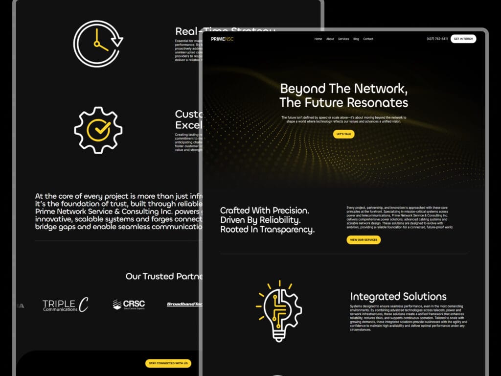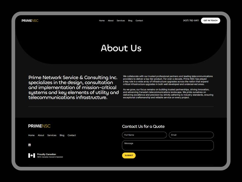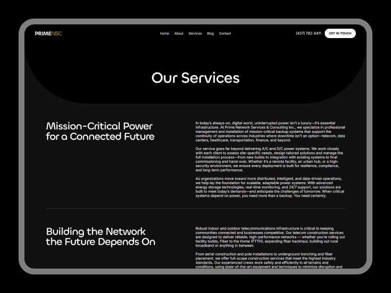 Although PrimeNSC had long established itself as a reliable name in the telecom industry, its existing website did not reflect the scale or professionalism of the work being done. The design was dated, and the messaging lacked clarity. As the company expanded its footprint and built relationships with high-profile partners like Bell and Rogers, it became essential to establish a stronger brand presence online. The site needed to communicate reliability and technical capability while remaining accessible and easy to use for both clients and internal staff.