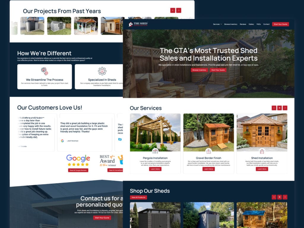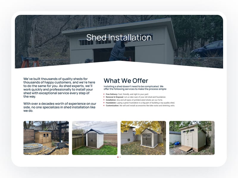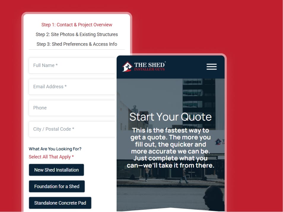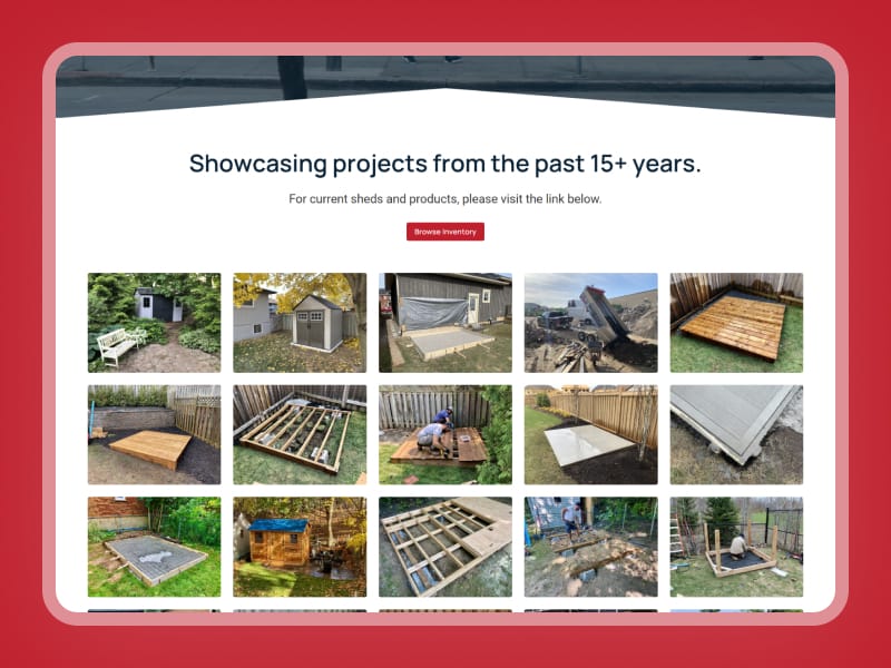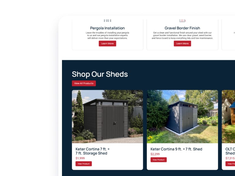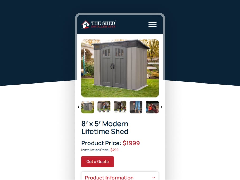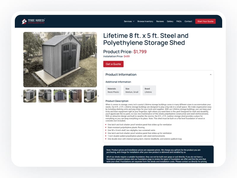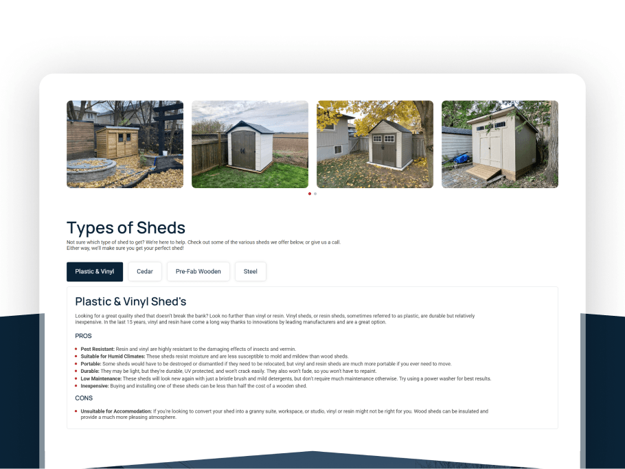 We developed a custom product inventory page that allows users to filter shed options by brand, size, and material, making it easier to find the right fit. Additionally, we built a tailored three-step quote form with conditional logic to guide users through the process efficiently and ensure more accurate inquiries.