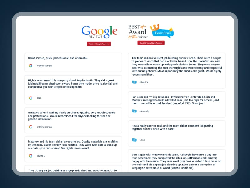 The Shed Installer Guys are Toronto’s leading experts in shed, gazebo, pergola, and playset installations. With over a decade of hands-on experience, the company has earned a strong reputation for precision work and customer-focused service. Whether installing customer-supplied kits or their own line of pre-fabricated sheds, their team handles everything from site prep to final placement with efficiency and care.