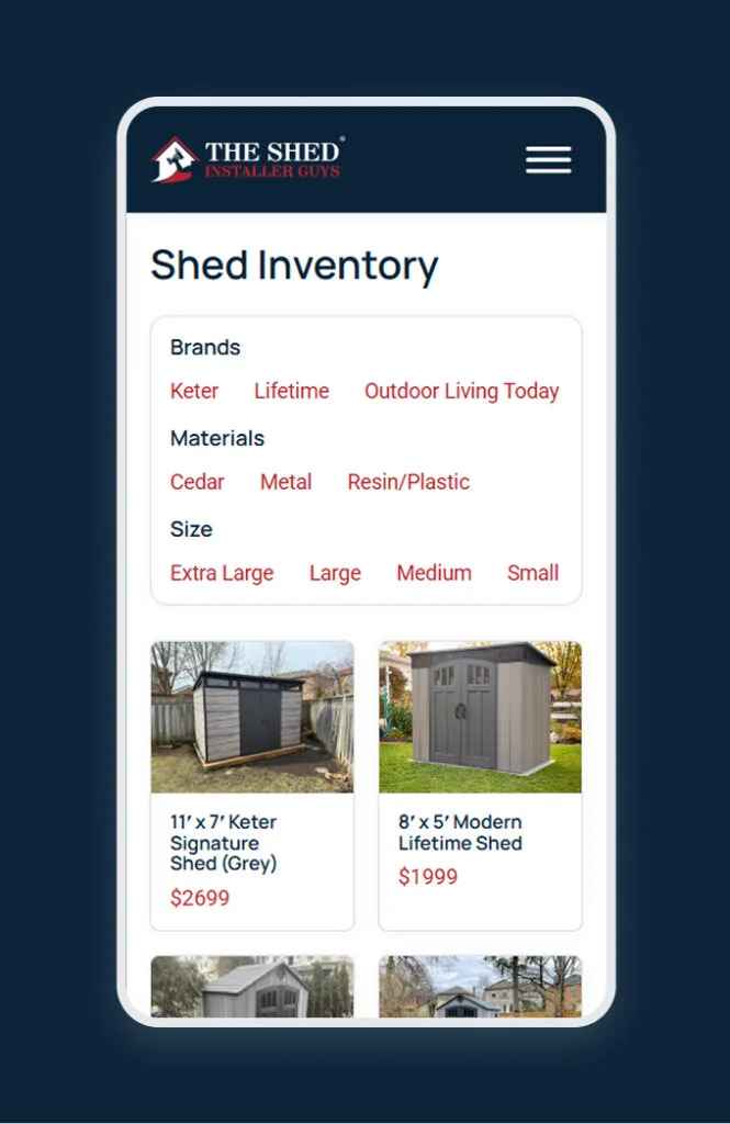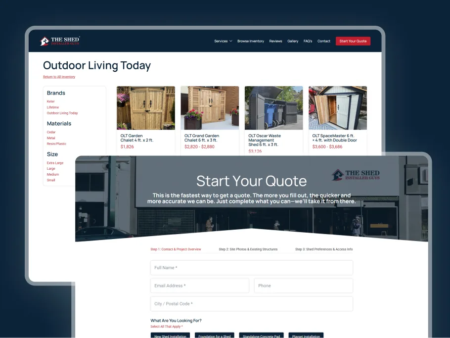 We developed a custom product inventory page that allows users to filter shed options by brand, size, and material, making it easier to find the right fit. Additionally, we built a tailored three-step quote form with conditional logic to guide users through the process efficiently and ensure more accurate inquiries.